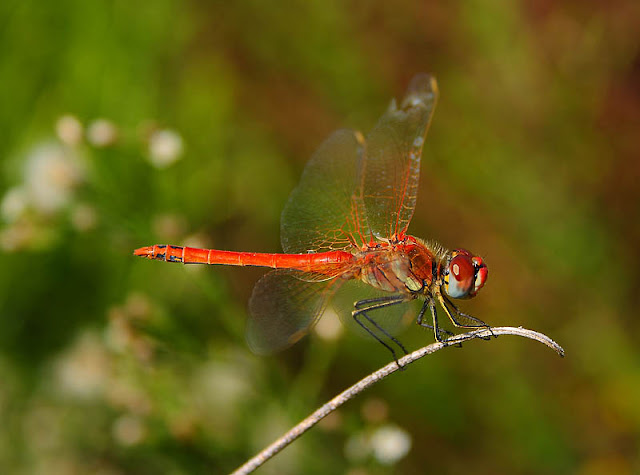 To my eye, dragonflies are nature's idea of a helicopter, although their flight mechanics are quite different (flapping flight vs. propeller flight). Or it's rather the other way round, chopper is humans' idea of a dragonfly. Apart from red, local dragonflies come in yellow, green and blue, glittering in the sun like Christmas tree baubles.