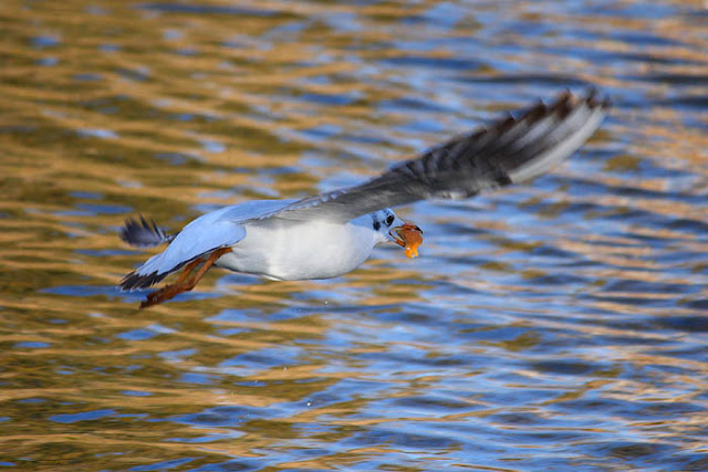This gull breeds in colonies in large reed beds or marshes, or on islands in lakes. Like most gulls, it is highly gregarious in winter, that's when a sizeable flock visits our pond and hangs around until spring. It is not a pelagic species, and is rarely seen at sea far from coasts.