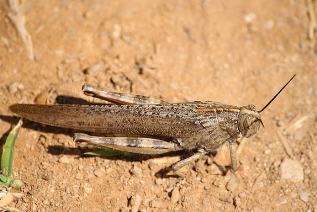 Egyptian grasshopper (Anacridium aegyptium), or the 'Egyptian Locust', is a species belonging to the family Acrididae present in most of Europe, in eastern Palearctic, in the Near East and North and tropical Africa. It is one of the largest European grasshoppers: adult males can be up to 30–55 millimetres (1.2–2.2 in) long, while females are up to 65–70 millimetres (2.6–2.8 in) long. They are usually gray, brown or olive coloured, while hind tibiae being blue and hind femora orange. They have distinctive eyes with vertical black and white stripes. This solitary species is folivore and not harmful to crops. Adults can mainly be encountered in August and September in warm and dry habitats. Spawning occurs in spring just under the soil surface and the nymphs appear in April.