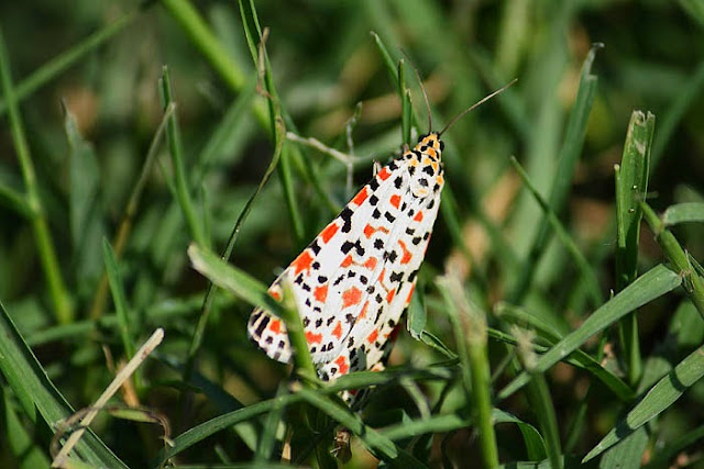 I've never seen this spectacular moth before — it popped out of the blue, fluttered past me and vanished into thin air. That's the only picture I've managed to take, but I hope to spot it again in the future. Crimson Speckled Footman (Utetheisa pulchella) is a moth of the family Arctiidae. It is found in Africa, Southern Europe, Central and Southern Asia and Australia.