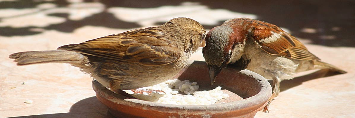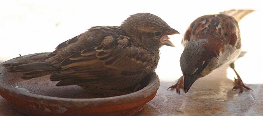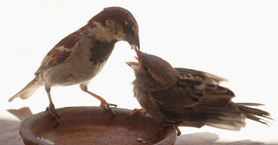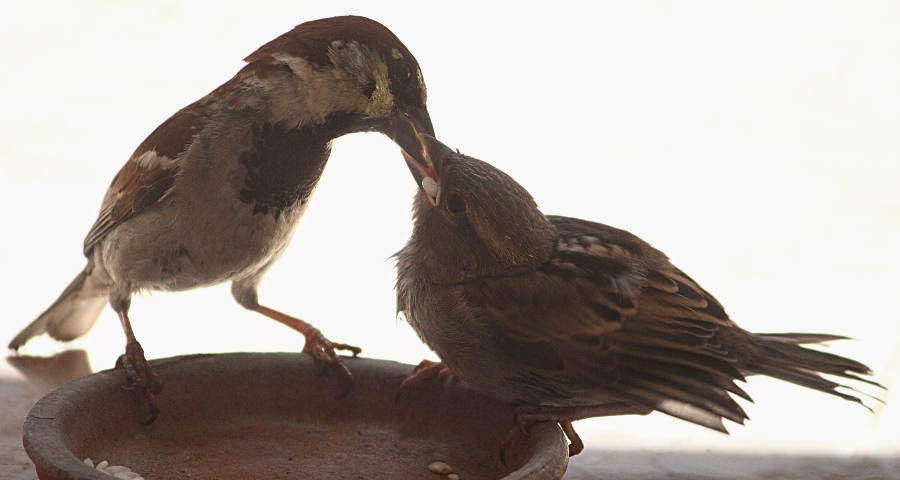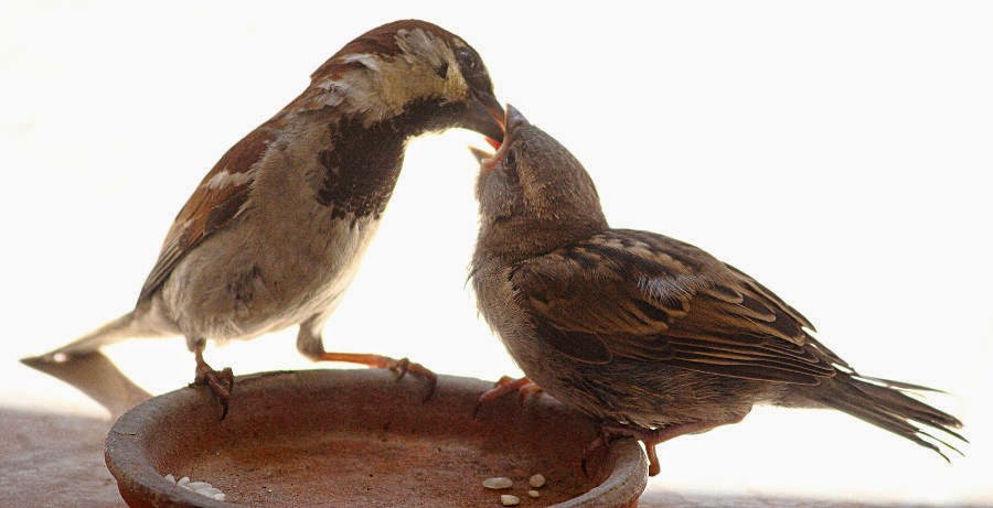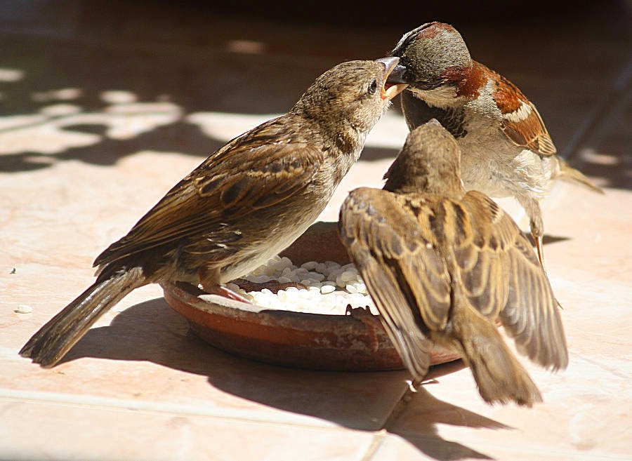 House Sparrow (Passer domesticus) male and his chick feeding on rice (© LightColourShade. All rights reserved) |