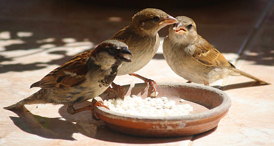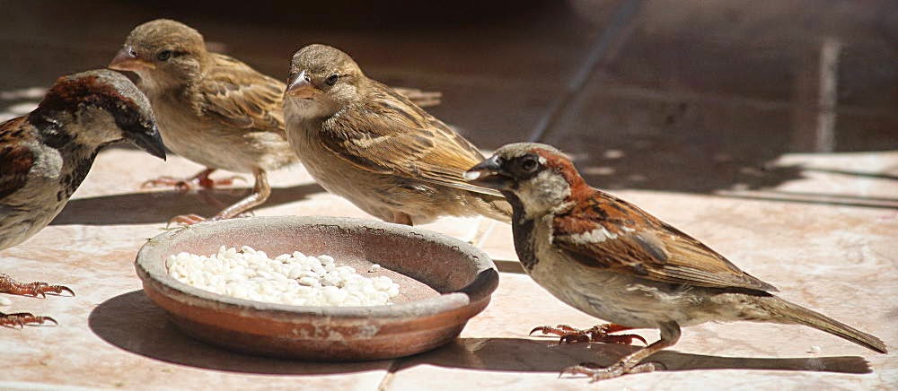 House Sparrow (Passer domesticus) family feeding on rice grains. (© LightColourShade. All rights reserved) |