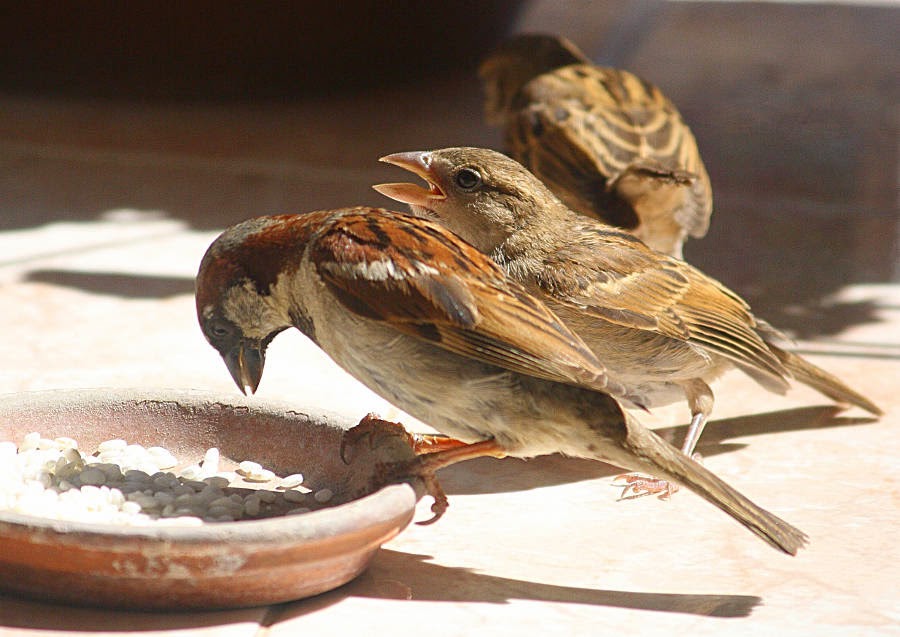 House Sparrow (Passer domesticus) male feeding his chick rice grains 2. (by-nc-nd) |